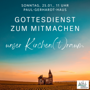 Am 25.01. feiern wir um 11 Uhr im Paul-Gerhardt-Haus einen Gottesdienst für Groß- und Klein zum Thema: „Unser Kirchen(t)raum“.