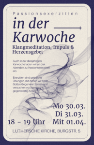 So laufen die Abende konkret ab: An drei Tagen der Karwoche treffen wir uns jeweils von Montag bis Mittwoch in der Zeit von 18 bis 19 Uhr in der Lutherischen Kirche um nach einer Klangmeditation und einem Impuls im Herzensgebet in Gottes Gegenwart ganz präsent zu sein.