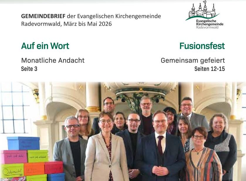 Wir freuen uns sehr, dass nun der erste gemeinsame Gemeindebrief erschienen ist. Sie finden ihn hier: Gemeindebrief Dez 25 – Feb 26 – Ev.-Luth. Kirchengemeinde Radevormwald Unsere Redakteurin Julia Klinkusch schreibt dazu: Ein neuer Name, ein neues Layout – und doch vertraut: Mit der ersten Ausgabe von „Zwischen den Kirchtürmen“ halten Sie den neuen gemeinsamen Gemeindebrief in den Händen. Ein Name mit Bedeutung „Zwischen den Kirchtürmen“ – dieser Titel ist mit Bedacht gewählt. Die Kirchtürme prägen seit jeher das Bild… Weiterlesen »Erster gemeinsamer Gemeindebrief
