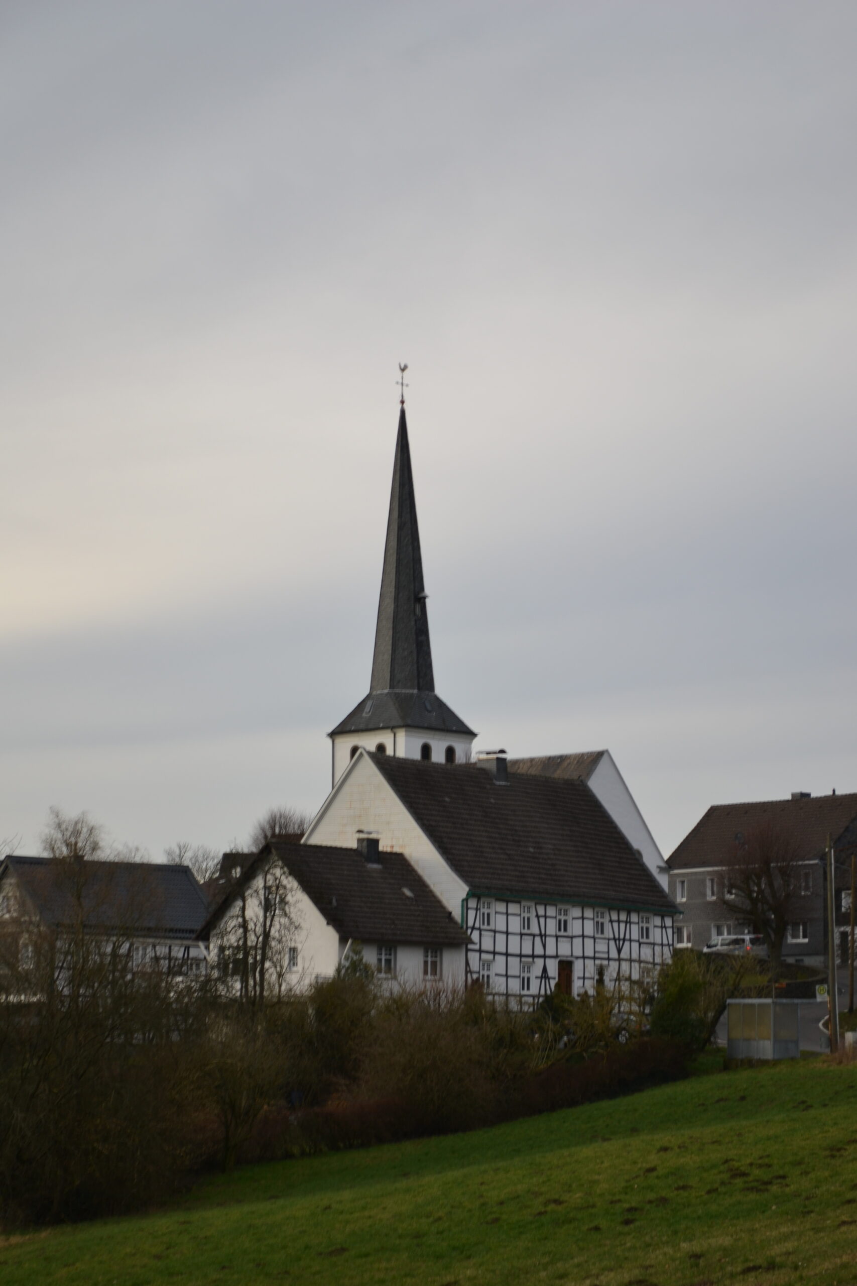 Das Kirchenschiff wird im Innern von einem Tonnengewölbe abgeschlossen. Die Ausstattung des Gotteshauses besteht aus dreiseitig umlaufenden Emporen und den Prinzipalstücken Altar, Kanzel und Orgel, die in einem typisch bergischen Aufbau zusammengefasst sind. Mit dem Orgelgehäuse zusammen reicht der Aufbau bis unter das Tonnengewölbe hinauf. Im Kirchneraum wurde darüber hinaus die farbige Fassung der ländlichen Rokoko-Ausstattung in den Jahren 1956-59 nach alten Befunden wiederhergestellt. Zur Kirche gehören der umgebende Kirchhof mit Grabmälern und einer Bruchsteinmauer, die ebenfalls unter Denkmalschutz stehen.